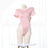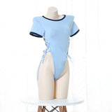 - This outrageously sexy white and black high slit lace-up bodysuit is seductive, and a little bit retro, baby!