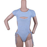 - With a gorgeous open back, and a string bikini style bottom, this daring and sexy little onesie is a must have for any vixen.