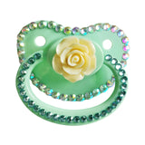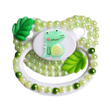 - With a vibrant green decorated pacifier base with holographic & pearly beads, and multiple dinosaur cabochons to choose from, what's not to love about this gender-neutral littlespace inspired dino custom paci?