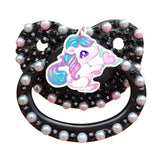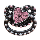 - With a black paci base decorated with holographic & pearly rhinestones, and various spooky halloween inspired cabochons, what's not to love about this spooky custom paci?