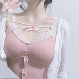 - This cotton pink tank top is made of quality knitted fabric with silky ribbons across the chest, lace spaghetti straps, bows and a stunning ruffle lace trim!