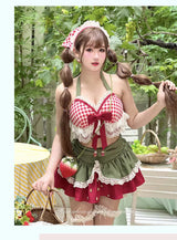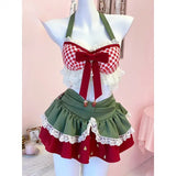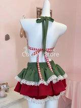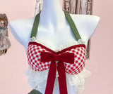 • Vibrant Halter Top: Features a red-and-white checkered pattern, accented by delicate lace trim and a bold red bow for a merry Christmas vibe.