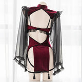 • This gorgeous cosplay lingerie set features luxurious red velvet fabric that drapes over you in all the right places, with transparent mesh long sleeves that billow and sweep!