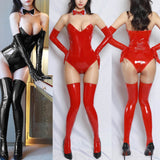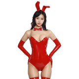 - The set includes a bold and vibrant red latex bodysuit that is designed to hug your curves in all the right places, while the bunny ears and bowtie collar add an extra layer of flirtatious fun to the ensemble.