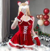 - A Christmas miracle, complete with EVERYTHING you need to embody the festive holiday spirit including matching christmas ear headband, sweet santa gloves,choker necklace, and an optional cloak!