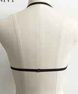 • This elegant and chic diamond shaped chest harness has several well placed stretchy straps that adorn your decolage in a very tasteful and elegant fashion.