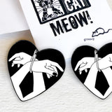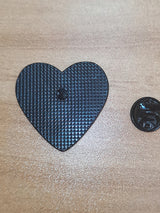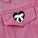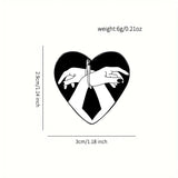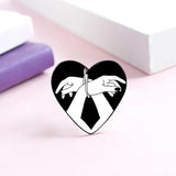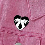 - Bold Design: A heart-shaped enamel pin featuring a monochrome illustration of two hands bound together with sleek handcuffs.