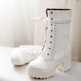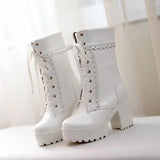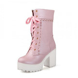 - A beautifully detailed pair of chunky ankle booties with lace trim embellishments and corset style laces.