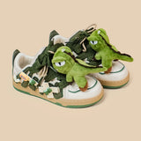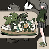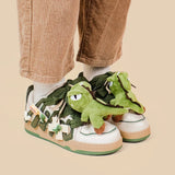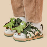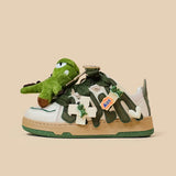 Charming Details: Each sneaker is adorned with delightful dinosaur plushies, from the mighty T-Rex to the cheerful Triceratops, nestled among creatively crafted laces. With vibrant greens and playful patterns, these shoes will make you feel like a kid at heart instantly.