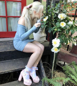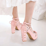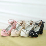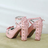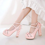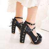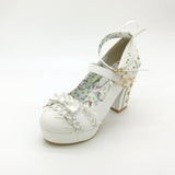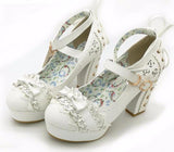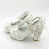 - A beautifully detailed pair of sweet lolita shoes with dainty lace trim, gorgeous bows, and a corsetted heel.