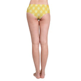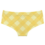 One size fits most (stretchy size) and features a cheeky yellow plaid design with a playful duck motif with the words "Play With Me".