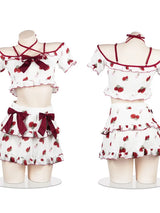 Made with soft fabric and complete with a two piece set and stockings, this kawaii set is adorned with adorable strawberries.