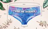- Featuring a beautiful swirling metallic blue fabric with the words "F*CK ME HARDER" written in drippy horror inspired font - what's not to love?