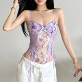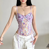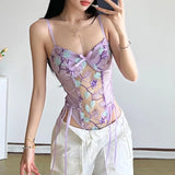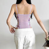 - Sheer mesh bodice with intricate purple and pastel blue floral embroidery for a soft, romantic feel