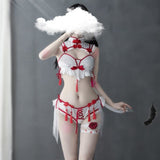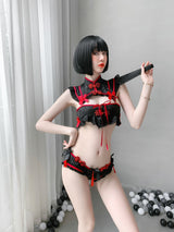 • Featuring a gorgeous high-neck top, matching skirt, and matching panties, with intricately detailed brasier!