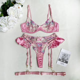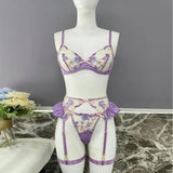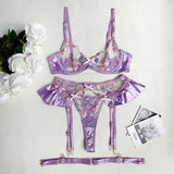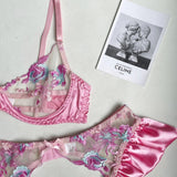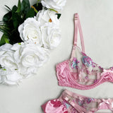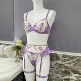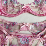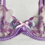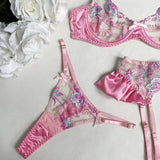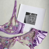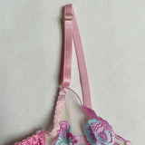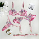 - Sheer mesh bra and panties adorned with delicate embroidered flowers for a soft and romantic feel