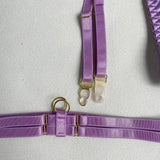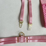 - Luxurious satin lavender straps and ruffled garter belt add a flirty and feminine touch