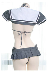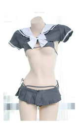 • Featuring quality grey pleated skirt, and matching micro school girl sailor scout inspired crop top, with a matching gret miniature bikini underneath! Everything is included!