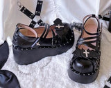 • A stunning gothic devil inspired bat wing lolita style platform wedge shoe with seductive & strappy buckles!