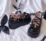 • Featuring devil / bat wings and a metal cross, with a 3 inch platform heel that is super easy and comfortable to walk in!