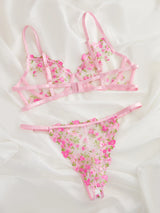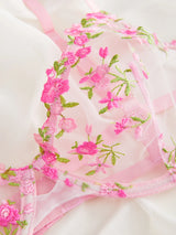 Floral Elegance: The lingerie set is adorned with vibrant pink flowers intricately embroidered onto a sheer, light gray background, making each piece a wearable piece of art. The flower details add a fresh, spring-like feel to the ensemble.