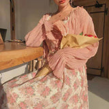 - With beautiful pearl embellished buttons, elegant ruffles, and a stunning rose flower print with a flowing long skirt, you'll want to live in this gorgeous dress.
