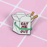 - This sassy "Eat Me Out' chinese takeout inspired enamel pin is the cutest little addition for any little to show off their spicy side in an incognito way!