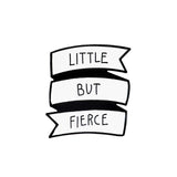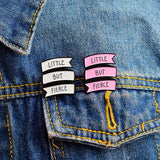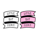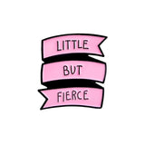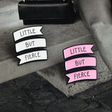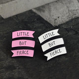 - This adorable pink or white ribbon "Little But Fierce" enamel pin is the perfect brooch to show your youthful and age playing side, while being perfectly incognito in day to day life!