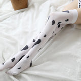 - Eye-Catching Design: These stockings boast a delightful pattern of bold, black cow spots scattered across a soft, pastel pink background, making them a standout addition to your wardrobe.