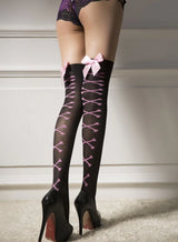 • These sweet corset lace-up printed stockings with a real pink silk bow at the top are guaranteed to score you endless compliments!