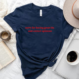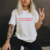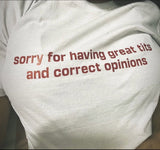 Make a bold and cheeky statement with the "Sorry for Having Great Tits and Correct Opinions" T-Shirt. Perfect for anyone who loves to combine confidence and humor, this top is an effortlessly cute addition to your wardrobe.