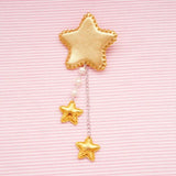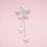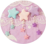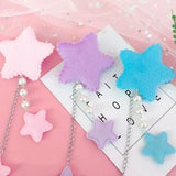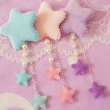 - A soft fuzzy fabric fairy-kei inspired star hair clip with dangling star charms and strings of pearls!