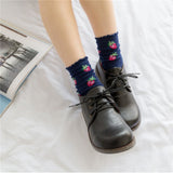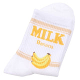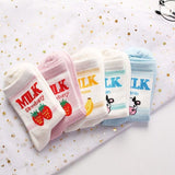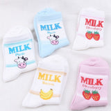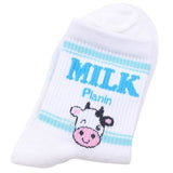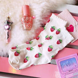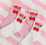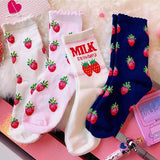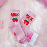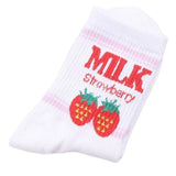 - A super cute pair of strawberry milk socks in white or pink inspired by traditional Japanese Harajuku fashion aesthetic.