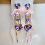 - Perfectly placed pink satin ribbons and pearls push these dangle earrings over the end.
