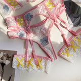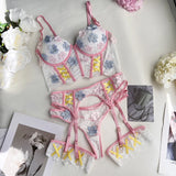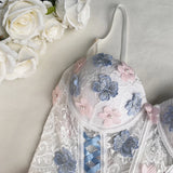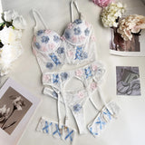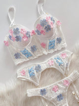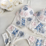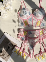 - Delightful Design: This Fairy Floral Garter Lingerie Set is the epitome of girly grace. Adorned with intricate pink and blue flowers on a pristine white base, this set exudes a fresh, fairy-tale charm.