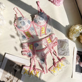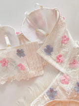 - Elegant Details: The bra and panties are crafted from a delicate white lace that provides a soft, romantic backdrop for the colorful floral appliqués. The set is finished with subtle bows and shimmering accents, enhancing its enchanting appeal.
