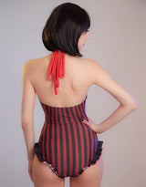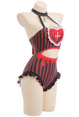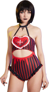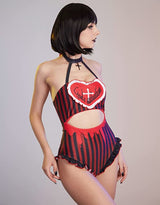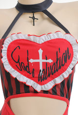 - Unique black and red striped "God's Salvation" onesie bodysuit