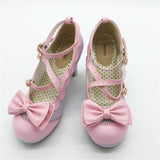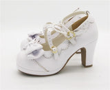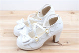 - A beautifully detailed pair of sweet lolita shoes with dainty strings of pearls, gorgeous bows, quality straps, and gold hardware.